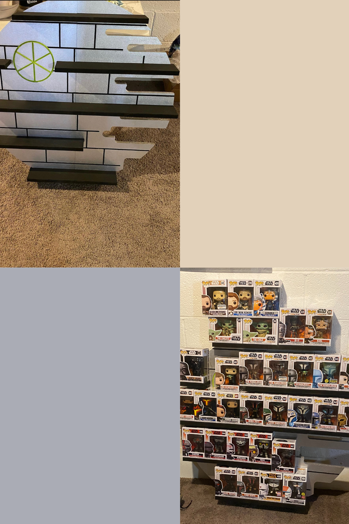 This shelf is modeled after the Death Star that was custom made for a Christmas present. The shelf holds approximately 24 Funko pops, is wall mounted, and is 3ft in diameter. The customer's boyfriend is a huge Star Wars fan.